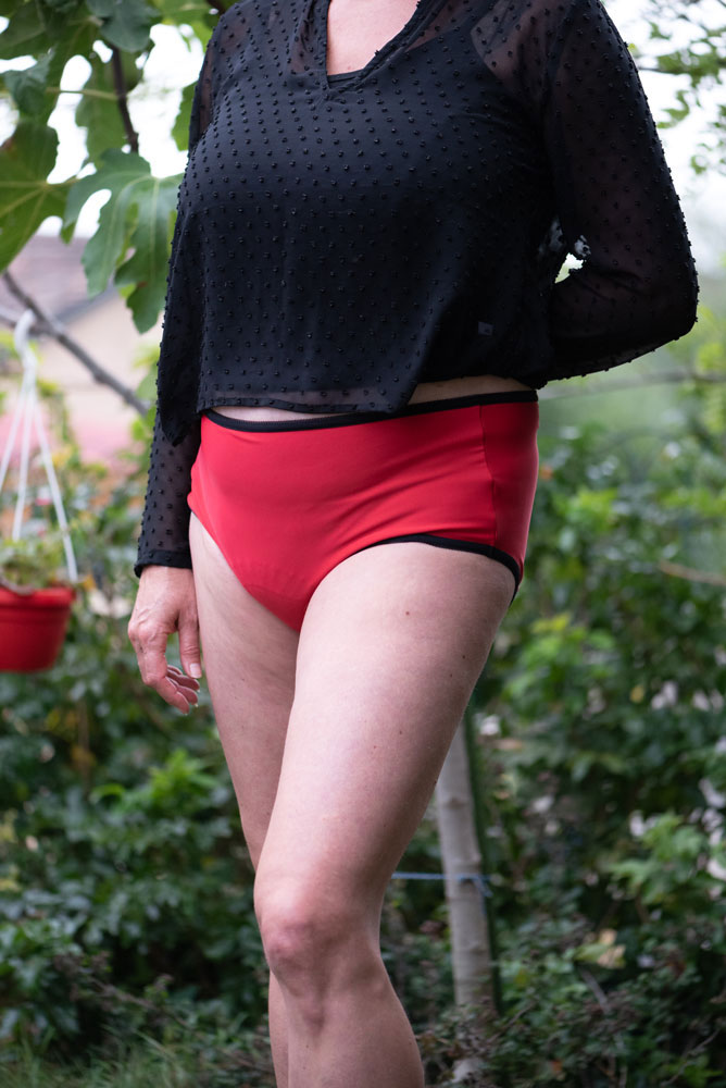 La Discrète est une culotte sensuelle avec sa couleur rouge intense. La taille est soulignée d’un élastique dentelé et celui de l’entrejambe (tour de cuisse) est ultra doux, il est parfaitement adapté aux peaux extrêmement sensibles. La coupe de la culotte est une taille semi-haute. L’élastique supérieur se positionne quelques centimètres en dessous du nombril, pour un plus grand confort et pour tenir bien au chaud le bas du ventre et le bas du dos.